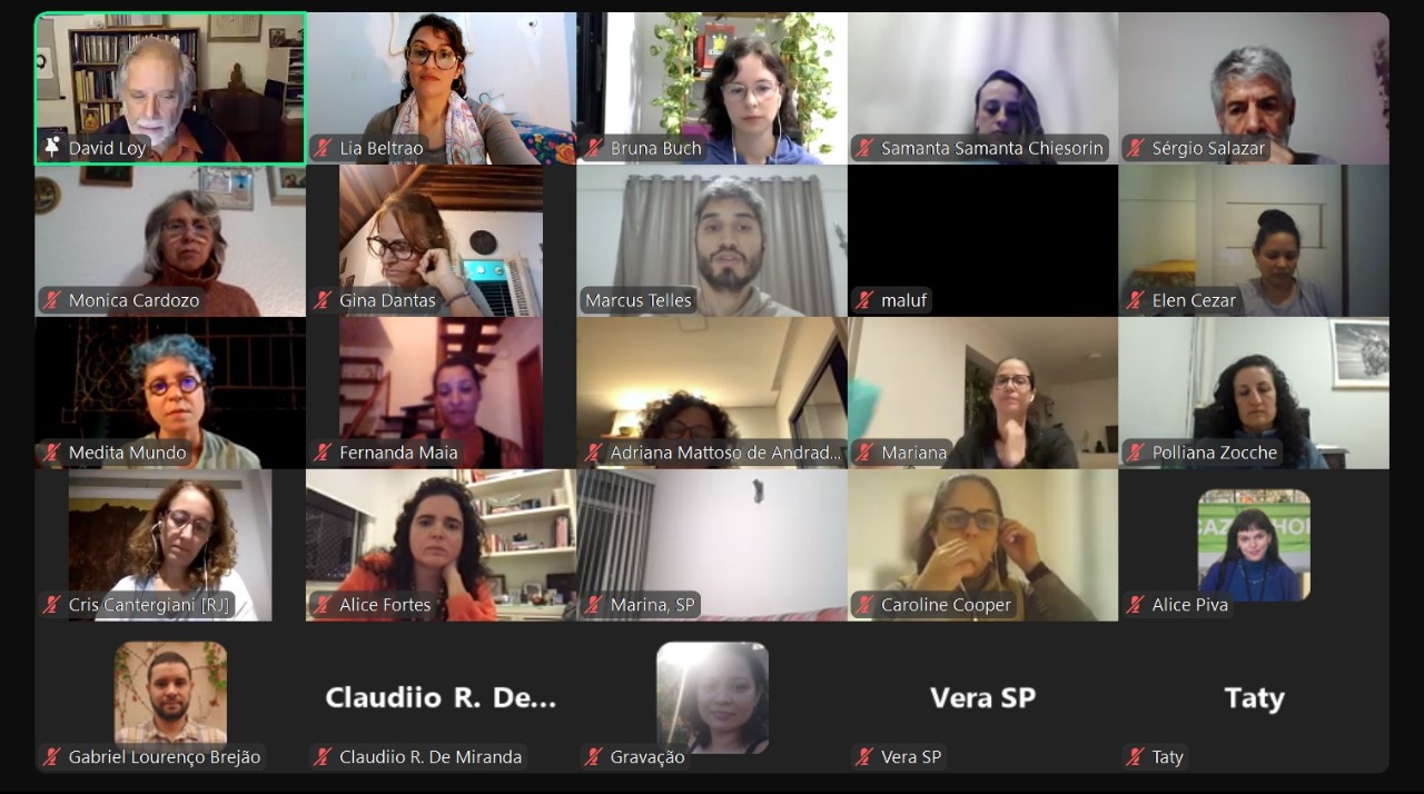 E o próprio sensei David Loy assumiu o risco de estar conosco para dizer que o seu livro precisava de atualização, contando sobre a diversidade de caminhos na filosofia budista e como diferentes tradições surgiram com atitudes distintas em relação ao mundo natural e aos nossos corpos. E para finalizar, o Sensei nos mostrou como o budismo pode transformar estes tempos sombrios, ao mesmo tempo em que é transformado por ele, trazendo um olhar surpreendente sobre o gesto de tocar a Terra que o Buda fez. Fomos lembradas que, assim como para as serpentes, precisamos tocar o chão para encontrar sabedoria.